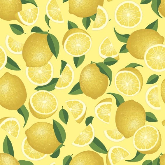 Solen strålar från detta livfulla mönster där saftiga citroner lyser upp mot en varm, gyllengul bakgrund. De friska gröna bladen skapar en vacker kontrast och förstärker känslan av en solmogen citruslund. Doften av sol, ljusa sommardagar och milda vindar känns nästan påtaglig, som om varje citron bär med sig en strimma av solens gyllene ljus.
