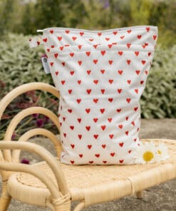 Denna stora hållbara påse för blöjor har en praktisk ögla som öppnas och stängs med en knapp. Detta utökar antalet användningsområden! Hänga den på barnvagnen? Hänga den på ett skåpshandtag? Bära den i handen? Du kan också använda påsen till annat än blöjor och tvättlappar. Packa kläder i den till resan? Perfekt att förvara blöta handdukar och badkläder i på väg hem från stranden!